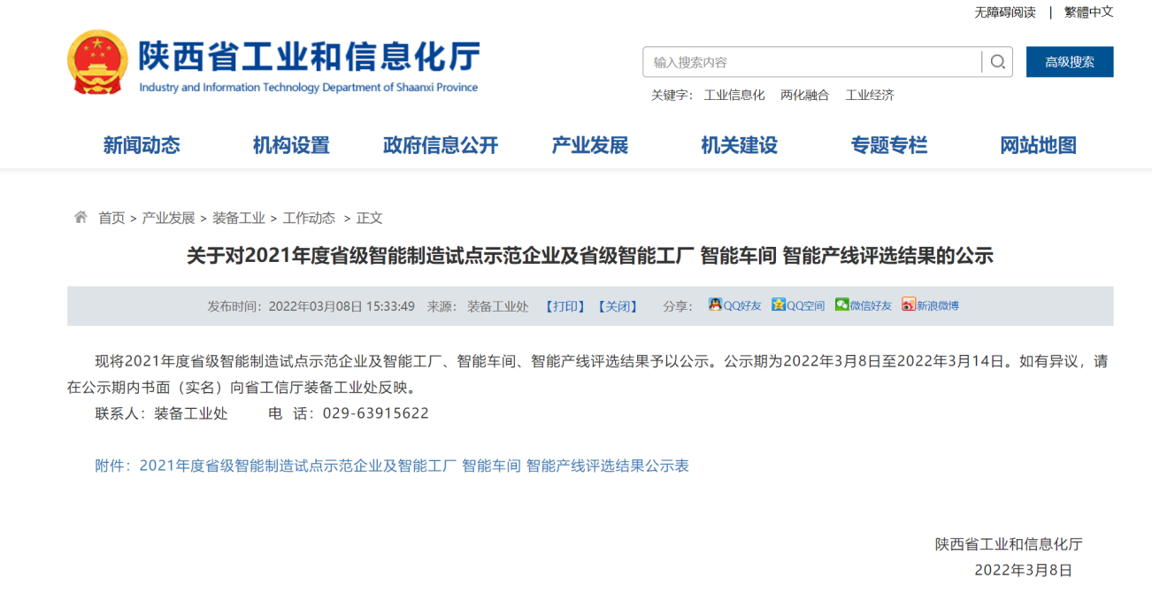 3月14日,陜西省工信廳裝備工業發布2021年度省級智能制造試點示范企業及省級智能工廠名單,寶光股份獲評“2021年度省級智能工廠”。