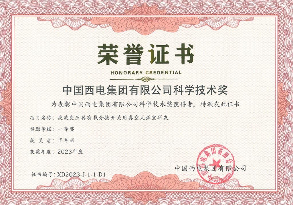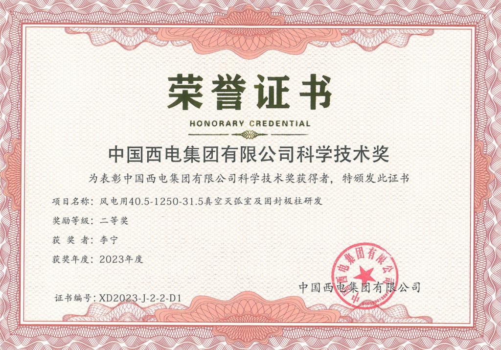 近日,寶光股份《換流變壓器有載分接開關(guān)用真空滅弧室研發(fā)》與《風電用40.5 kV/1250 A-31.5 kA真空滅弧室及固封極柱研發(fā)》兩個技術(shù)創(chuàng)新項目,分別榮獲2023年度中國西電集團科學技術(shù)獎“一等獎”與“二等獎”!