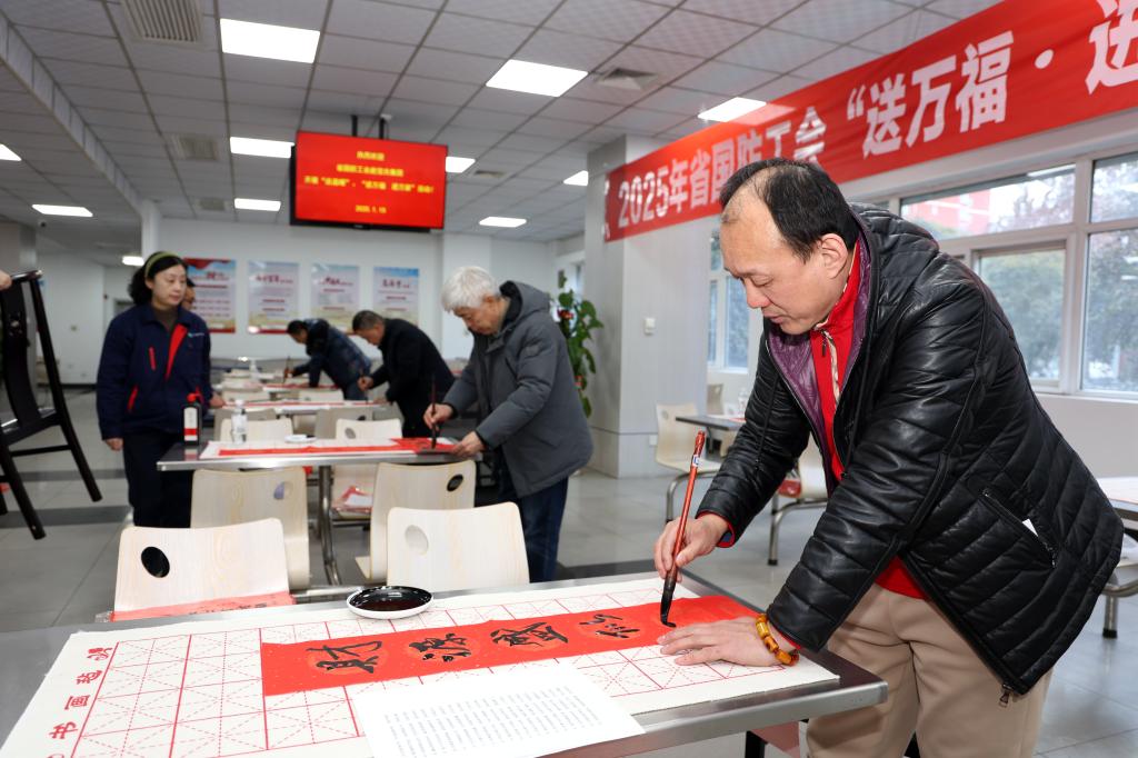 在送春聯(lián)現(xiàn)場,書法家們揮毫潑墨、筆走龍蛇,聞?dòng)嵍鴣淼穆毠ぜ娂妵跁琅云诖善贰R煌R活D、一起一落,一句句散發(fā)著清新墨香的吉祥語句躍然紙上,“一元二氣三陽泰,四時(shí)五福六合春”“春滿乾坤千里秀,時(shí)逢盛世萬家興”,一副副滿載美好祝福的春聯(lián)和“福”字躍然紙上,既有辭舊迎新的熱切祈盼,也有對幸福生活的美好祝福。職工們拿到寫滿祝福和美好祝愿的春聯(lián),喜悅之情溢于言表。活動(dòng)期間共送出春聯(lián)近400余幅,福字300余幅。